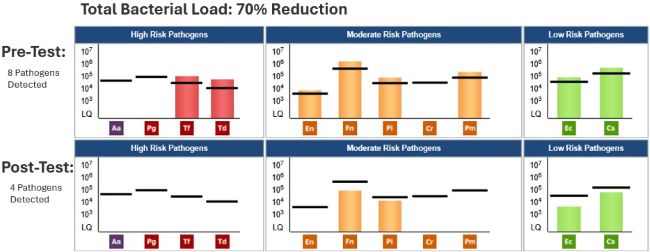 The patient responded to the periodontal therapy favorably, resulting in zero bleeding on probing. We will continue to monitor some isolated periodontal pockets on #14DB and #15MB and test again when needed. The post MyPerioPath® had a 70% reduction in periodontal pathogen (burden) load which is a significant shift. Patient was very happy with the look and feel of his teeth. In subsequent visits, we will address our suspicion of sleep disordered breathing.