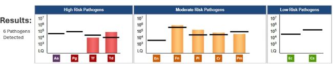 Pregnant, periodontal maintenance patient appointed with increasing periodontal measurements over the last two periodontal maintenance appointments. The goal of testing is to establish the cause for the increase of inflammation.
