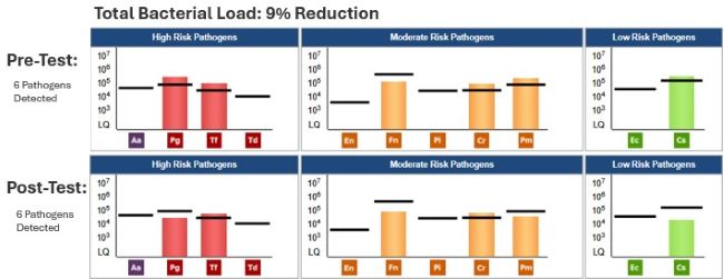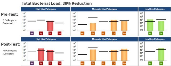 At 8 weeks post dental and functional medicine treatment, the patient observed a decrease in swelling and joint soreness, especially in her hands and wrists. Her perception of daily pain significantly reduced. The Baker’s cyst reduced in size approximately 50%. CRP dramatically improved, reducing from 26.2 to 4.8. With the increased bacterial load but reduced disease activity (MMP8 40-MMP8 <10), we theorize that, based on the oral genomic data, more bacterial interventions will continue to calm local and systemic inflammation and modulate acquired immunity, continuing to reduce active periodontal disease and systemic inflammation.