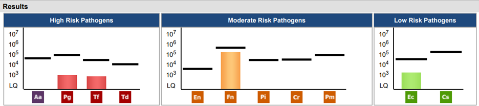 Great news, after completing the recommended treatment based on your initial test results, we have been able to reduce below detection 1 high risk pathogen, 4 moderate pathogens, and 1 low risk pathogen and lowered your overall bacterial load. Now that we’ve seen how well you’ve responded to this treatment, we will continue to monitor your progress with periodic saliva retests, and quarterly laser cleanings with local antibiotics when needed. We’re excited to continue to help aid your body in fighting inflammatory responses and keeping your overall health better.